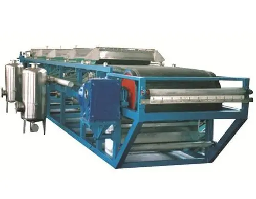 帶式過(guò)濾機(jī)利用過(guò)濾布兩側(cè)的壓力差,將材料中的大部分水分通過(guò)過(guò)過(guò)濾布,流出機(jī)體外,材料在過(guò)濾室內(nèi)形成過(guò)濾餅,達(dá)到過(guò)濾目的。過(guò)濾過(guò)程中濾布兩側(cè)存在較大壓力差,提高過(guò)濾速度降低蛋糕含水,采用特制濾布,清晰過(guò)濾液,過(guò)濾效果比真空過(guò)濾機(jī)理想得多。